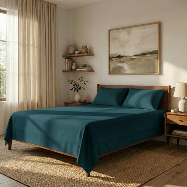 दो तकिये के कवर के साथ टील माइक्रोफाइबर फ्लैट बेडशीट - मुलायम, सुंदर और झुर्रियों से मुक्त