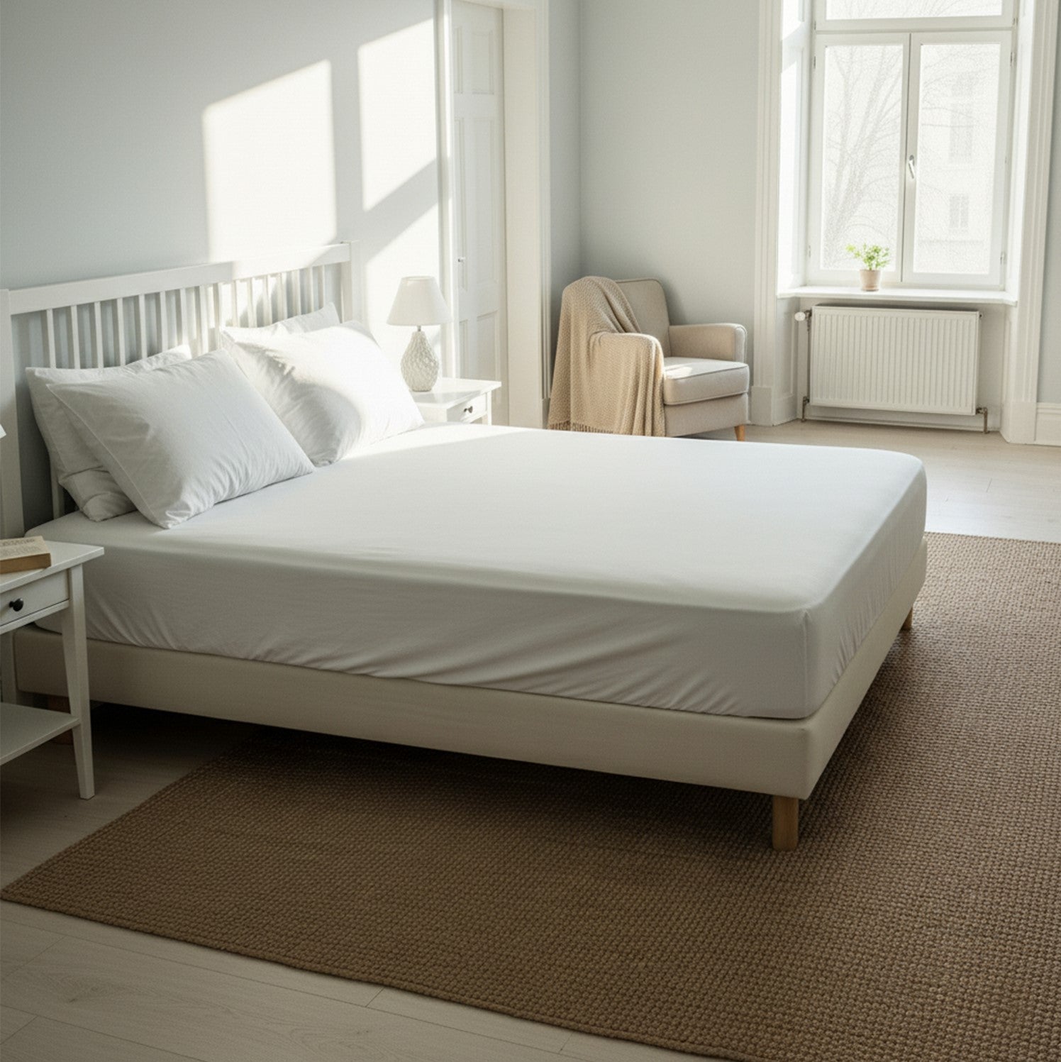 This White Fitted Cotton Bedsheet is made from premium 100% cotton, ensuring a soft, breathable, and comfortable feel on the skin. Its classic white color adds a clean, fresh, and timeless elegance to any bedroom decor. The fitted design provides a snug and secure grip around mattress corners, keeping the sheet perfectly in place for a smooth and restful sleep experience. Crafted from durable fabric, it promises long-lasting use and is easy to care for, being fully machine washable. Available in Single, Double, Queen, King, & Super King Sizes, this bedsheet offers a perfect fit and a sophisticated look for every standard mattress.